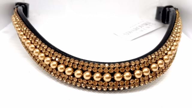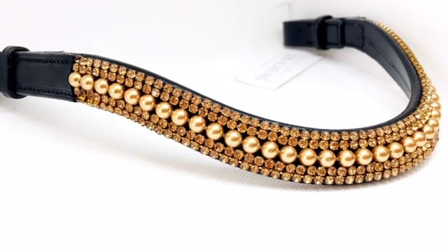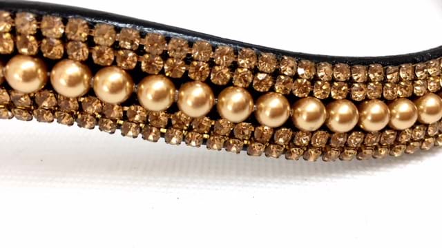- There are 5 rows of gems. Two smaller gold crystal rows on the top and bottom, then a row of gold pearls in the middle.