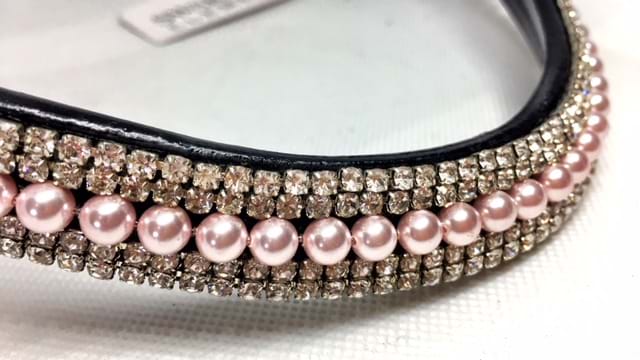 - There are 5 rows of gems. Two smaller white crystal rows on the top and bottom, then a row of pink pearls in the middle.