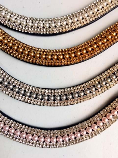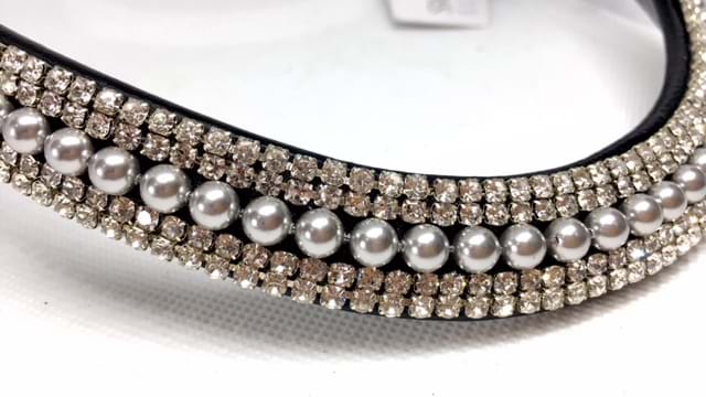 - There are 5 rows of gems. Two smaller white crystal rows on the top and bottom, then a row of silver pearls in the middle.