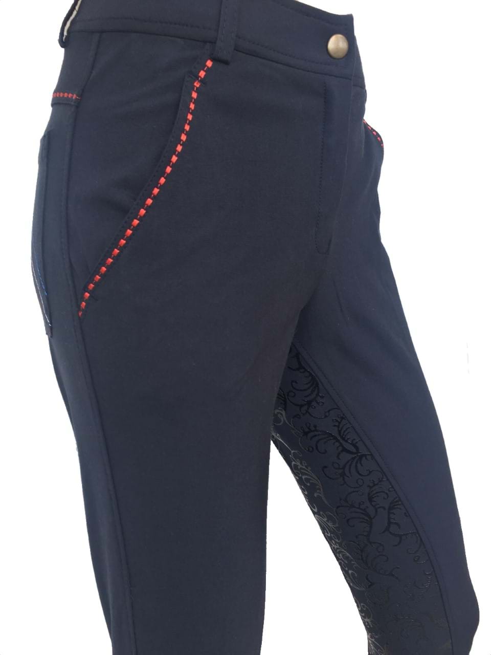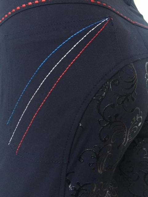- Navy micro woven fabric (65% cotton, 28% nylon, 7% spandex). This is a light comfortable fabric, perfect for summer riding